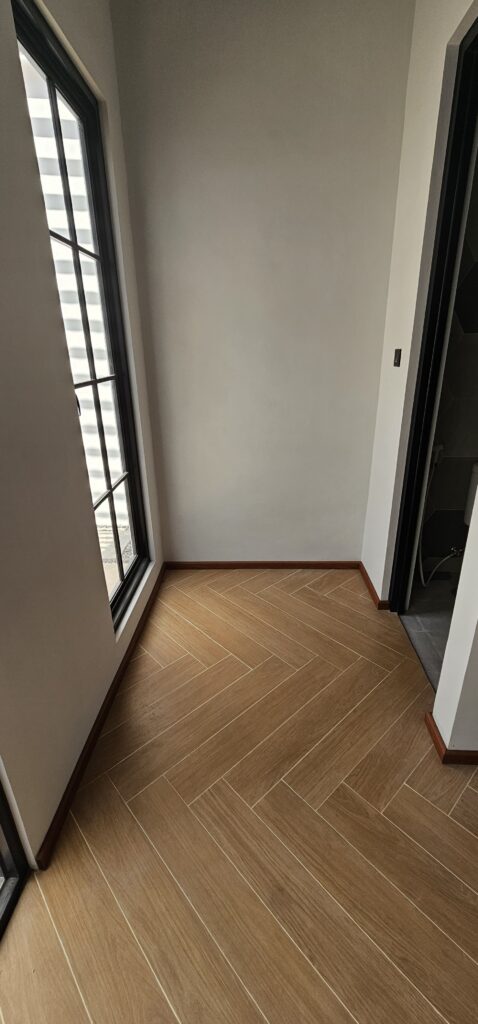 Pola herringbone punya daya tarik visual luar biasa. Garis diagonalnya menarik perhatian, menambah dimensi pada ruangan polos, dan menciptakan efek space lebih besar—ideal untuk rumah mungil di Depok atau Yogyakarta. Nuansa Eropa klasiknya pair sempurna dengan gaya minimalis modern tropis, bikin rumah terlihat premium tanpa renovasi besar.