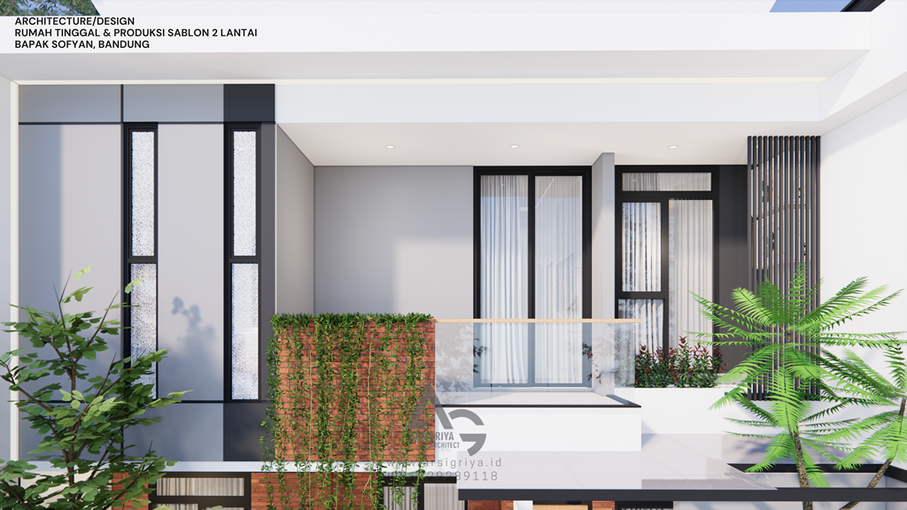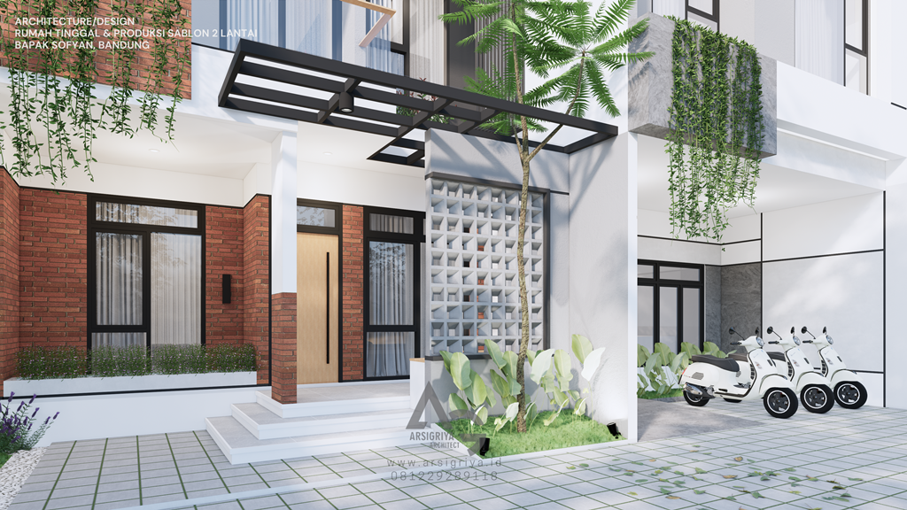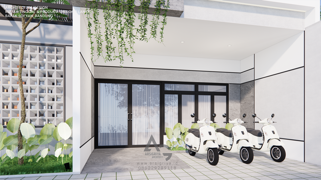On this occasion, the Arsigriya Architects team received a design project located in Bandung, West Java, with a site area of 645m2. On this land, several buildings with complex functions will be built. For this initial stage, we had the opportunity to design 2 buildings first, namely a residence and a screen printing production house. The concept used in the design of the residential house is tropical modern and for the production house building it carries a modern industrial concept. To combine the two concepts of the two buildings, the same color tone is used in the appearance of the building so that even though it carries a different concept, it still looks harmonious.