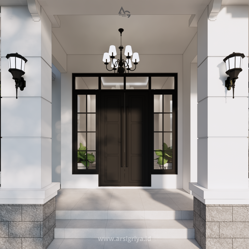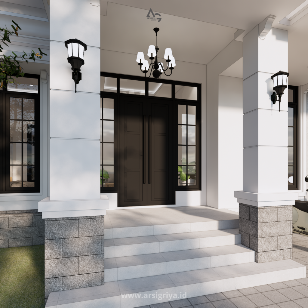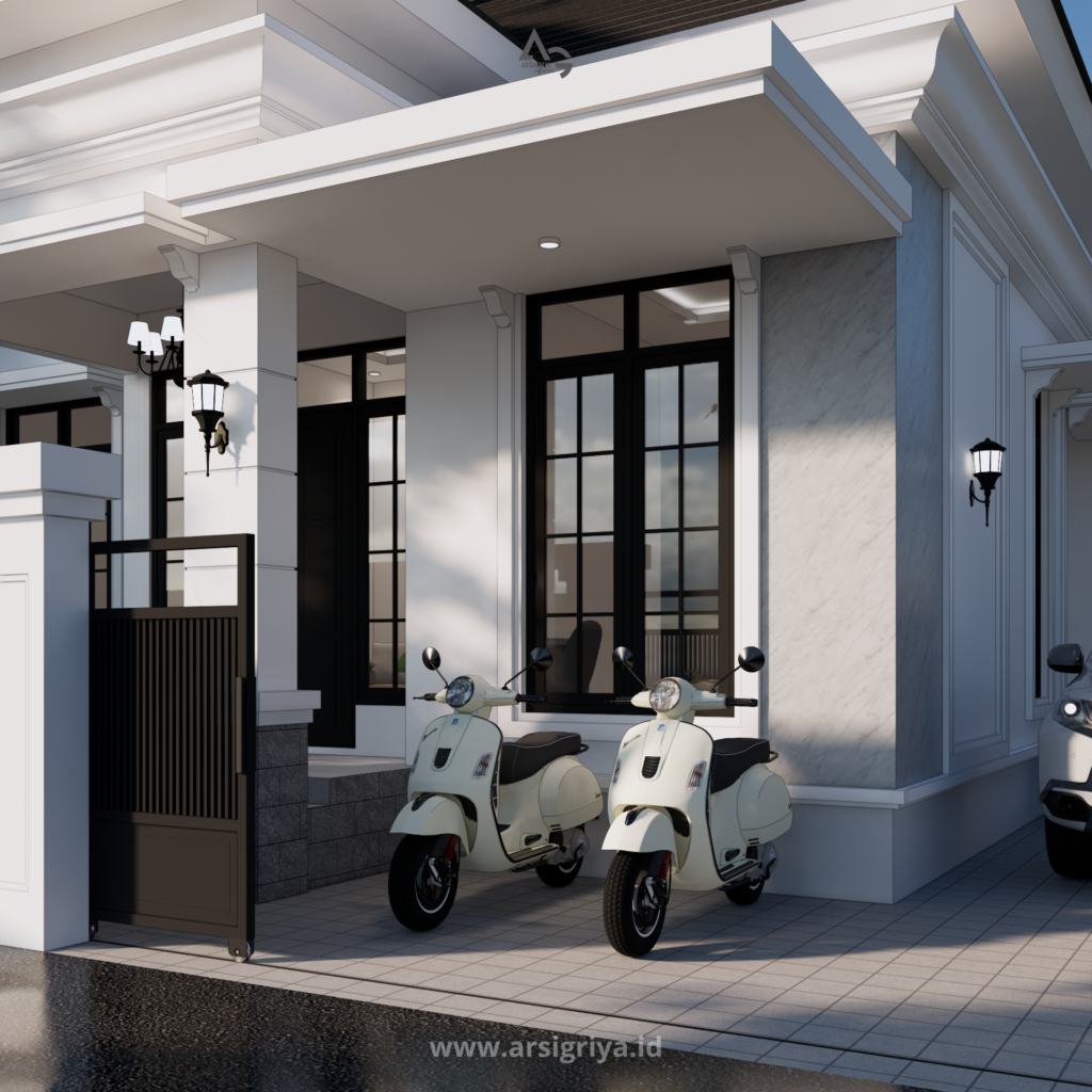 Konsep modern klasik yang diterapkan pada tampilan eksterior rumah ini tidak hanya terlihat dari bentuk profil dinding dan jenis atap limasan, tetapi juga diperkuat oleh pemilihan material yang menghasilkan kontras visual yang elegan. Penggunaan genteng beton flat berwarna hitam memberikan sentuhan modern yang tegas dan minimalis pada bentuk atap klasik (limasan). Kusen jendela dan pintu yang tinggi, lebar, dan bersekat dengan warna hitam pekat menjadi aksen kuat yang membingkai pemandangan luar, sekaligus memaksimalkan masuknya cahaya. Sementara itu, dominasi warna monokrom—putih, abu-abu, dan hitam—pada fasad menciptakan tampilan yang bersih, timeless, dan berkelas, menegaskan kesan mewah namun tetap hangat.