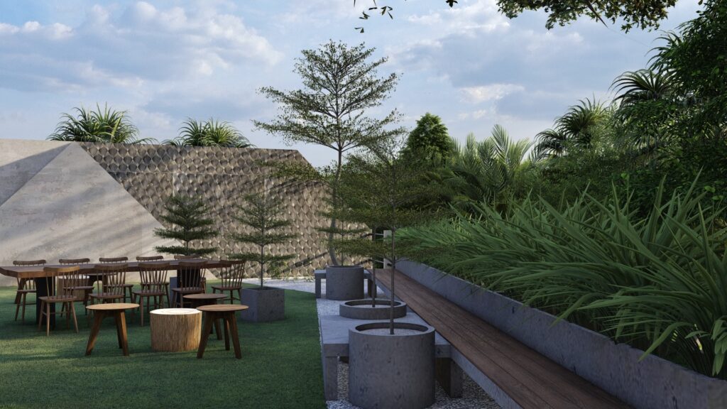 Selain itu, kami juga menempatkan tumbuhan hijau yang memperindah ruangan dan menciptakan suasana yang asri di area. Pemilihan tanaman calathea lutea dan pohon Ketapang kencana memberikan sentuhan tropis yang kuat. Pada area outdoor jiuga menggunakan alas rumput.