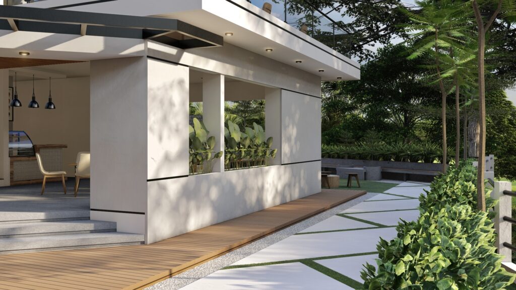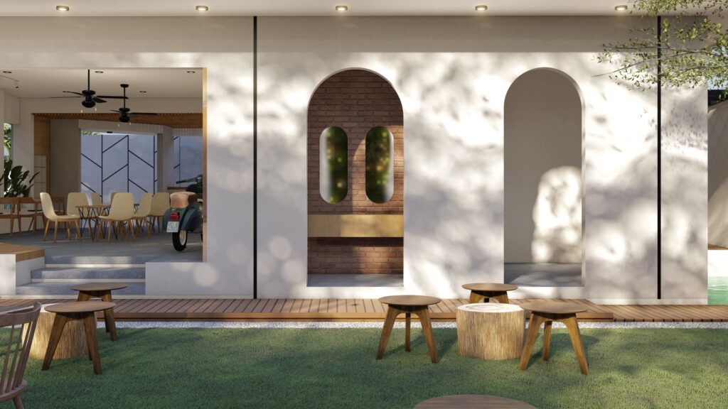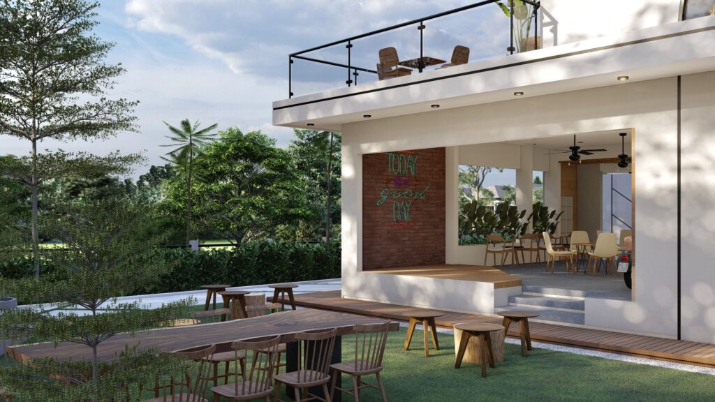 Cafe is a favorite place for many people to relax, work or hang out with friends. In this 2-storey cafe design project, we carry a modern tropical concept that will give visitors a fresh and alluring feel. With an open outdoor area and a comfortable indoor area, this cafe is the ideal place to enjoy the fresh atmosphere of nature while enjoying a meal.