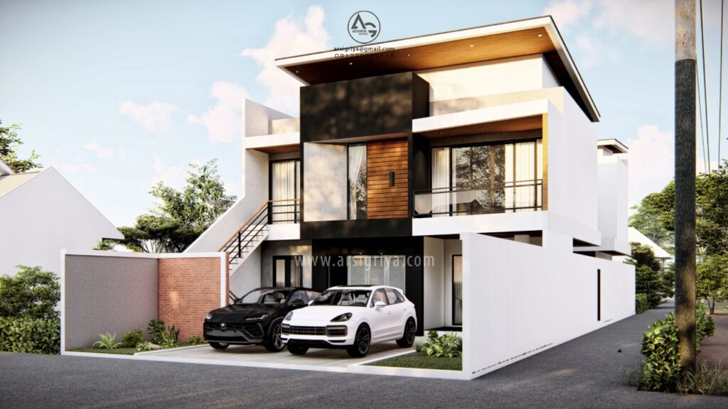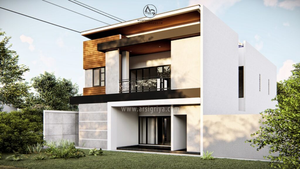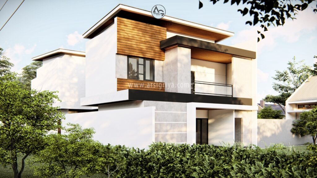 Rumah tinggal ini didesain dengan konsep modern kontemporer. Klien kami menginginkan agar tampilan fasade bangunan menonjol dan berkarakter. Dipilihlah komposisi bentuk kotak dengan kombinasi bentuk segitiga yang sederhana dengan permainan pada dinding, lantai balkon, serta atap miring dan permainan topi-topi. Material yang digunakan pada fasade cukup beragam antara lain kayu, cat warna putih, plester acian (unfinished), serta cat kamprot warna gelap. Pada pagar menggunakan kombinasi material dinding plester finishing cat putih dan batu alam.