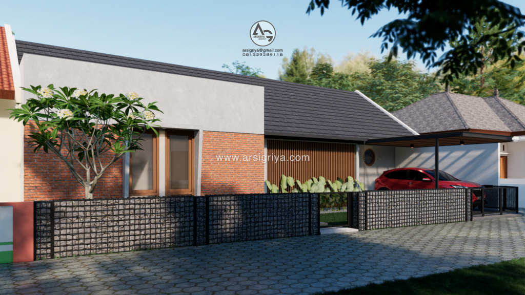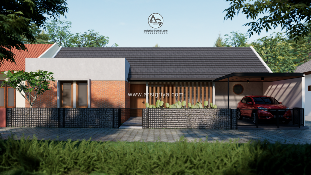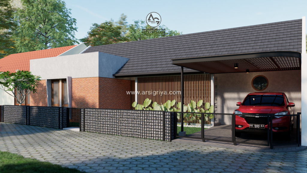 This 1-story house is located in the Sleman area, DI Yogyakarta, has a land area of 180 m2 with a building area of 106 m2. The owner wants a house consisting of only one floor with lots of air circulation and natural light. The land is on the corner of the road so that the processing of the building facade facing the road will be made more attractive