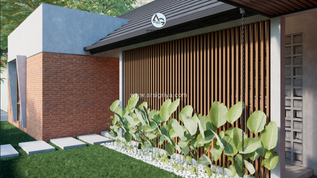 In the building facade area, there are several wooden elements that are very typical of the tropical concept. The combination of wood with concrete finishing and exposed brick makes this building look natural and calmer. Then with the addition of plants in the front garden area also gives the impression that this building looks alive and beautiful. Almost all the use of materials on the facade is only finished with coating. In addition, wooden lattices are also applied to the front terrace area to create privacy for residents in the house and create an interesting or iconic point of view on this building.